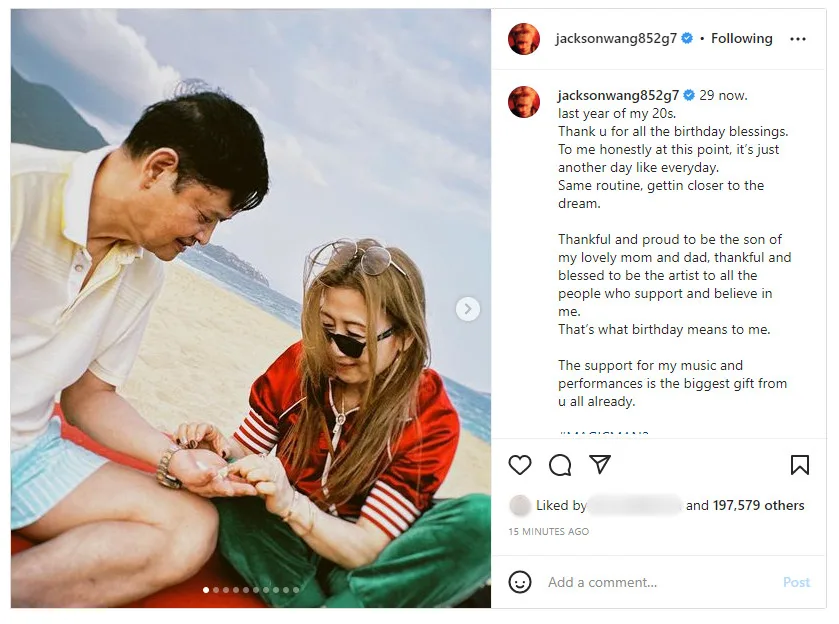 Jackson Wang has been busy preparing for his North and South American “MAGIC MAN” tour but that hasn’t stop him from posting an Instagram update on his 29th birthday today (Tuesday, 28th March). The international superstar uploaded a series of photos and videos with a heartwarming caption dedicated to not only his fans but also his parents.