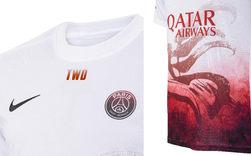 Meanwhile, the pre-match white warm-up jersey offers simplicity with a red gradient flows naturally upward from deep burgundy to softer red tones, integrating the spirit of traditional Chinese ink. On the reverse side, the Chinese calligraphic character for “horse” (馬) is rhythmically repeated as a structural background motif. The PSG red crest, TEAM WANG design insignia, and Nike Swoosh logo are featured across both front and back, ensuring visual coherence and a seamless flow in motion.