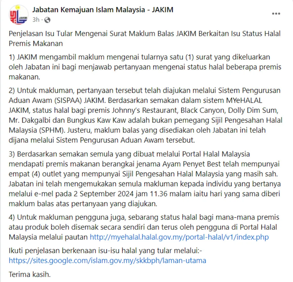 However, Dolly Dim Sum has previously shared that their central kitchen is halal-certified. The restaurant also said that it’s in the process of obtaining certification for its branches. In the previous letter, JAKIM stated that another popular eatery, Ayam Penyet Best, was not halal-certified. However, the agency updated its statement to clarify that four branches of the restaurant chain hold a valid halal certification. Towards the end of their statement, JAKIM urges the public to check the halal status of a premise or product through the Malaysian Halal Portal.