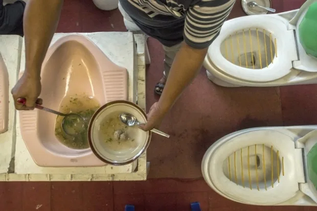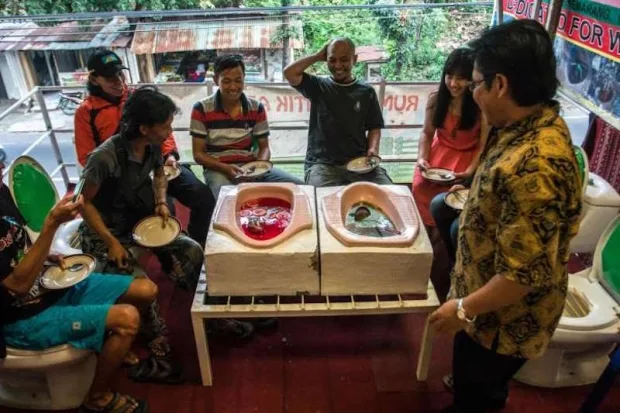 The “Jamban Cafe” resembles a normal toilet, where guests sit on upright toilets around a table and squat toilets are used as serving bowls. But don’t let the otherwise stomach-churning appearance fool you because everything is sterilised in the questionable-looking restaurant, according to Sukardi, a waiter at the eatery.