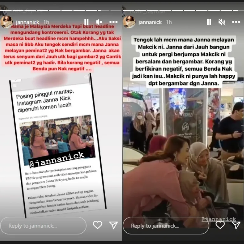 Recently, actress Janna Nick attended a screening event for her new movie “Juang” in which she starred alongside Zul Ariffin, Zizan Razak, and the late Adibah Noor. Her friendly appearance in a fan’s TikTok video went viral when her butt became the main focus of male fans who left lewd comments. The 27-year-old took to her Instagram to share her thoughts on the issue.