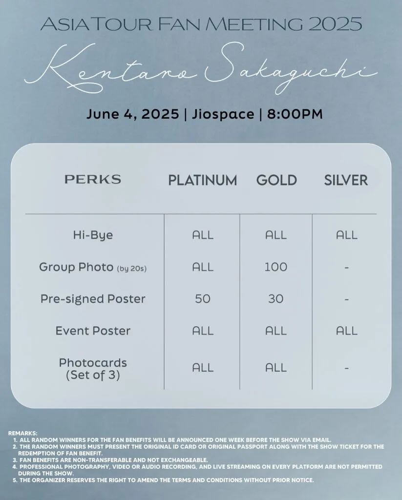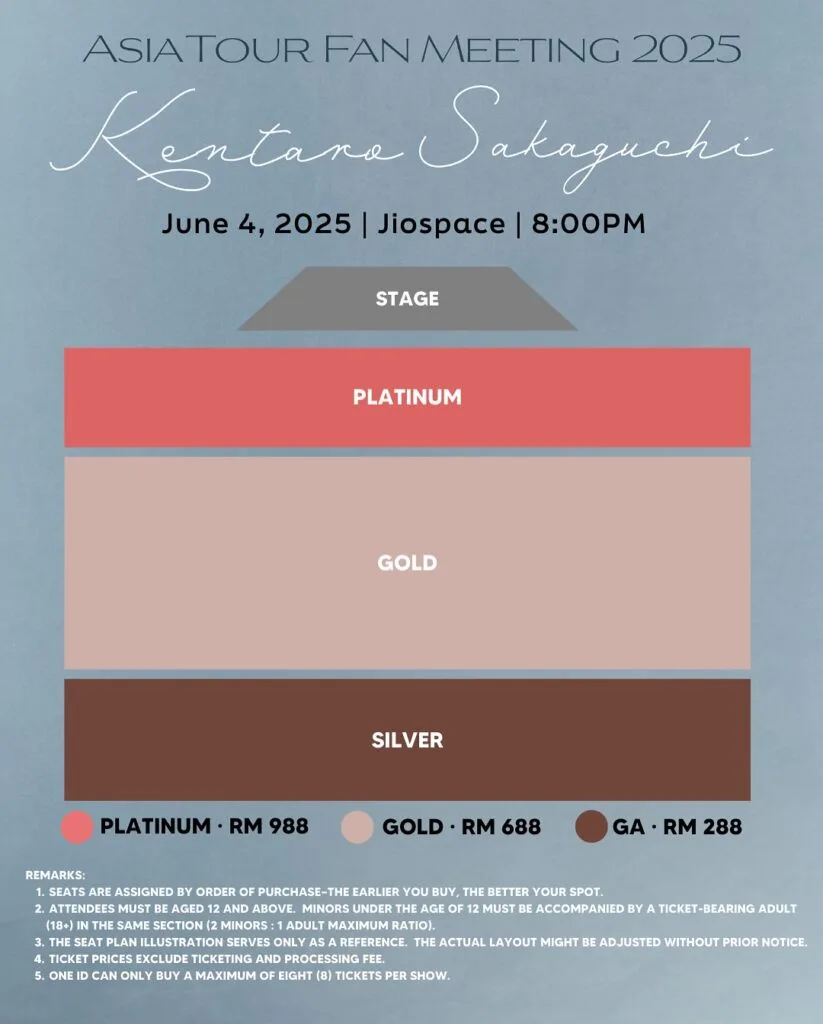 After a long wait, Mahocast and event organiser Banyak Bagus Entertainment has unveiled details to Kentaro Sakaguchi’s first fanmeeting in Kuala Lumpur! The actor will meet fans at JioSpace on 4th June 2025 (Wednesday). Seating plans have also been announced and tickets will go on sale on 25th April 2025 (Friday), via ticketmelon. There are also special benefits for ticket holders, so check out all the details below: