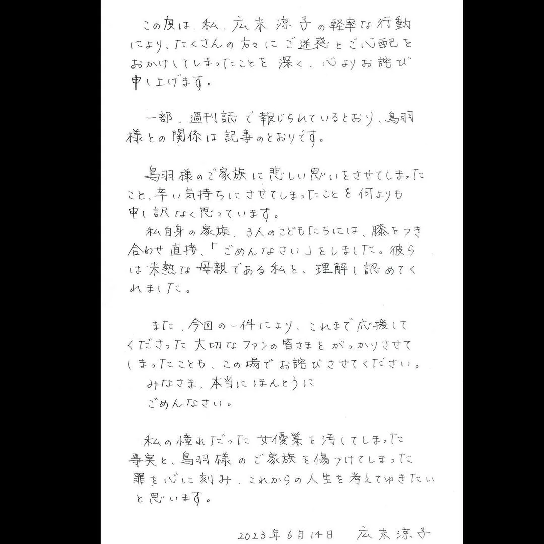 The post reads, “At this time, I, Hirosue Ryoko, would like to sincerely apologize for the inconvenience and concern caused to many people due to my thoughtless behavior. As it was reported in some weekly publications, my relationship with Mr. Toba is exactly as the article states. More than anything, I am sorry to Mr. Toba’s family for causing them sadness and pain. As for my family, I met directly face-to-face with my three children and told them ‘I’m sorry.’ They understood and acknowledged my immature behaviour. Moreover, I wish to apologise to my precious fans for letting them down due to this incident. Everyone, I am very sorry. I will spend the rest of my life thinking about the fact that I tarnished my acting career, which was my dream, and the sin of hurting Mr. Toba’s family.”