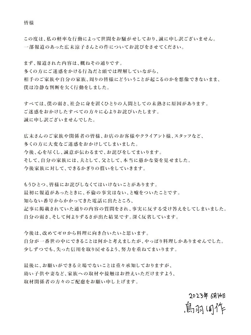 The chef captioned his post, “I would like to give an honest answer to the news report.” He apologised to Ryoko’s family for causing pain because of his sudden lack of judgment, and emphasised that he will reflect on his actions.