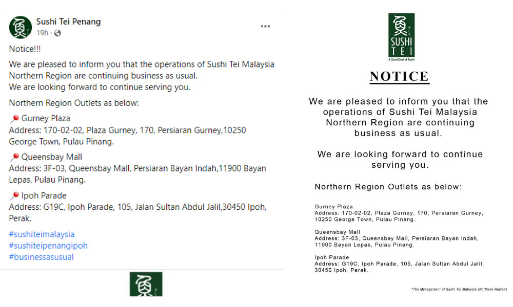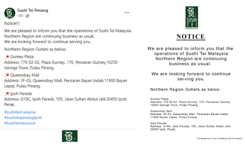 However, there is still good news for fans, especially those in the Northern regions. In a Facebook post, Sushi Tei Penang announced that three outlets in Penang and Perak are unaffected by the closure.