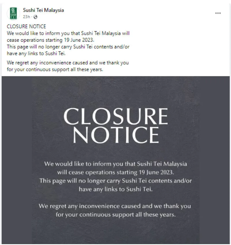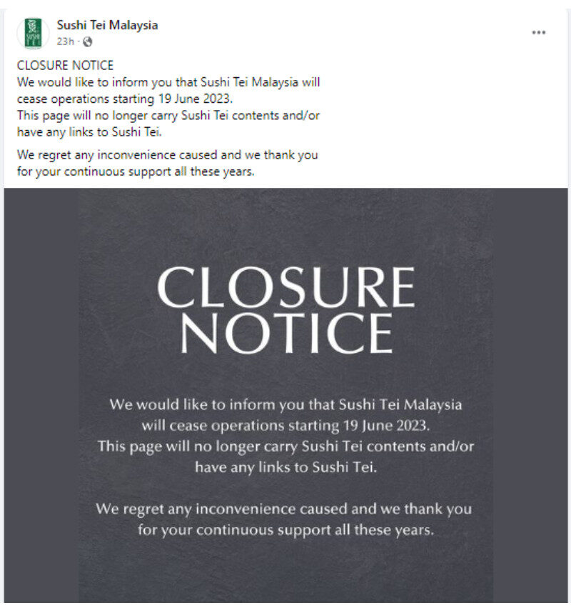 Through its official Facebook page, the restaurant informed customers that Sushi Tei Malaysia ceased operations on 19th June 2023. The post also stated that the Facebook page will no longer provide content or links related to Sushi Tei.