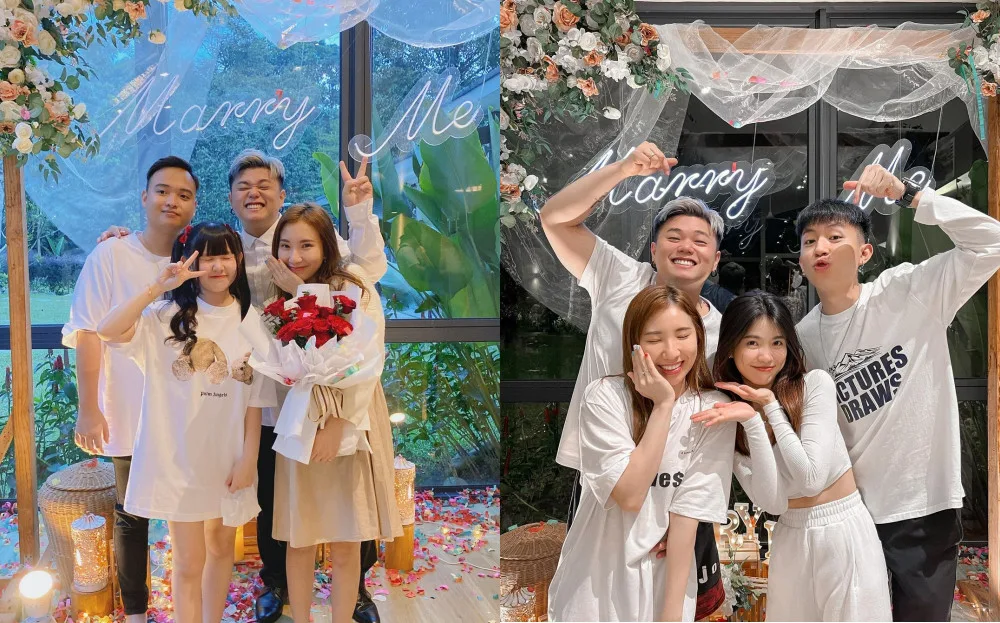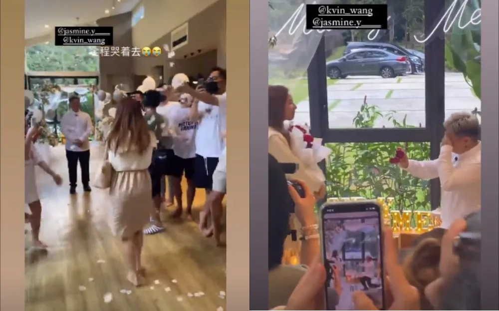 Kvin had apparently planned for the proposal with his friends, hoping to surprise Jasmine. The YouTuber spared no expense in making it the perfect engagement for his girlfriend. The place was beautifully decorated with balloons and flowers. Many of their friends and other influencers were in attendance, like Jasmine’s sister Findy Yang (小粉底) and Iven Lee (阿源).
