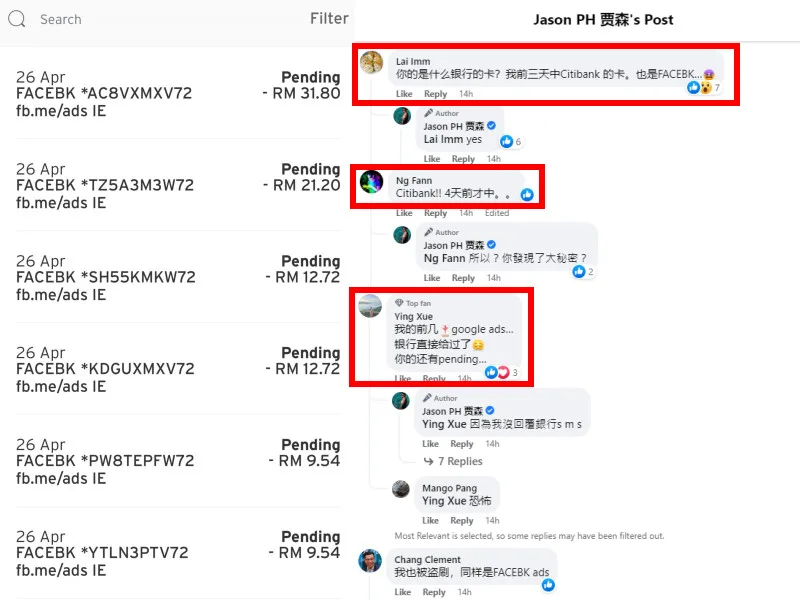 The artist shared yesterday (26th April) that he had fallen asleep and woken up to notifications on his phone. A screenshot showed several pending approvals from his credit card for six different transactions, all from Facebook ads. The transaction amounts varied between RM9.54 to RM31.80, totaling to RM97.52.