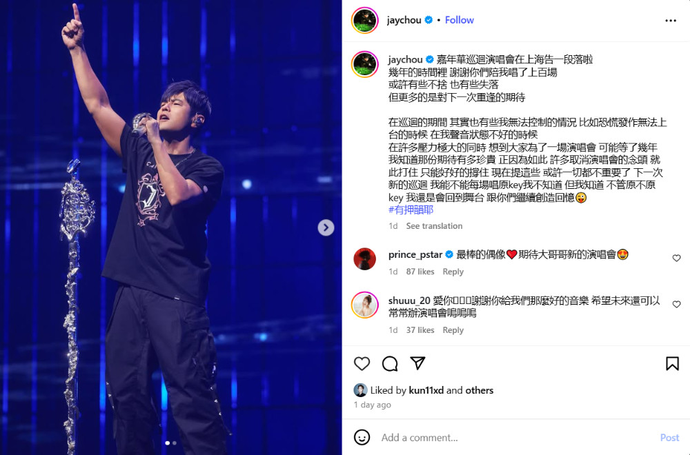 The singer also mentioned returning to the stage soon, saying, “I don’t know if I can sing in the original key for every show on the next tour, but I know that, regardless of whether I sing in the original key or not, I will still be back on stage to continue making memories with you.” In the meantime, Jay’s agency, JVR Music, hints that the Mandopop icon will launch a new tour in 2026 to celebrate his 25th anniversary.