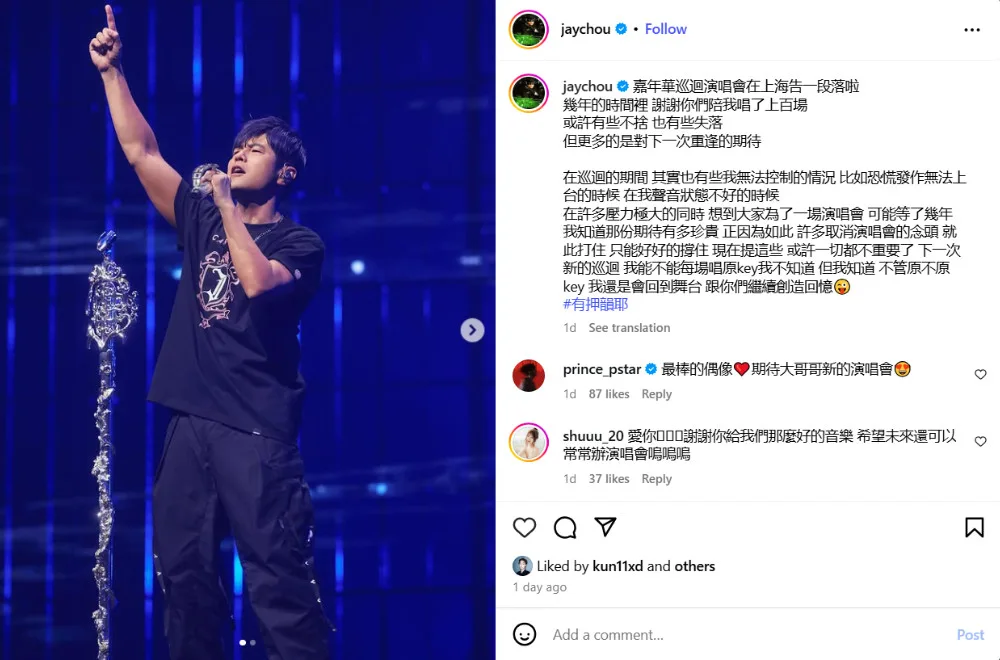 The singer also mentioned returning to the stage soon, saying, “I don’t know if I can sing in the original key for every show on the next tour, but I know that, regardless of whether I sing in the original key or not, I will still be back on stage to continue making memories with you.” In the meantime, Jay’s agency, JVR Music, hints that the Mandopop icon will launch a new tour in 2026 to celebrate his 25th anniversary.