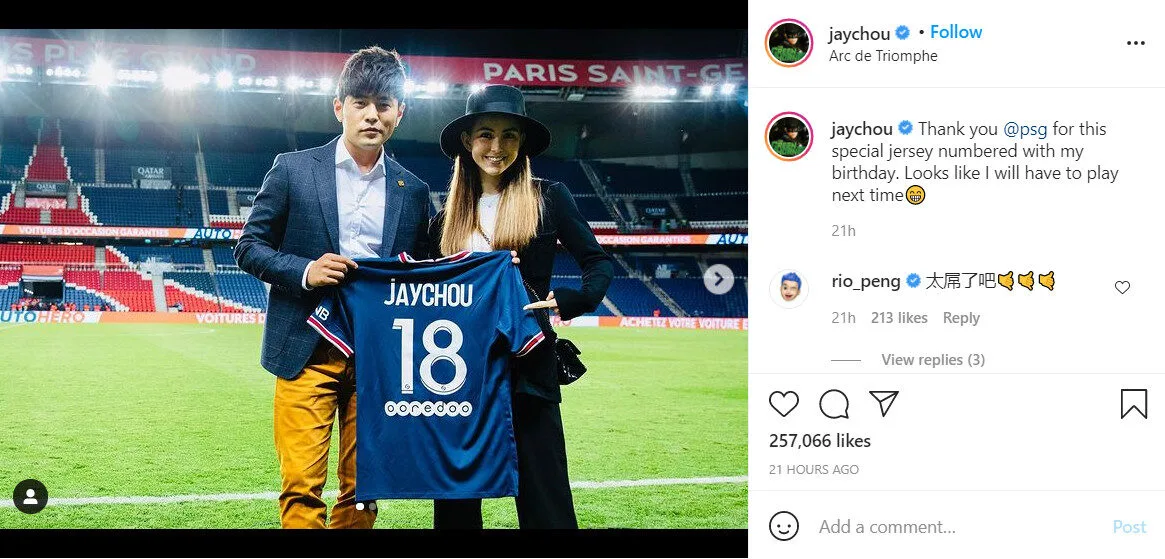 PSG’s surprise didn’t stop there. Apparently after the game, Jay Chou was gifted with his very own custom jersey. It had his name and the number 18 printed on it. He posted a photo of him and Hannah holding the jersey on Instagram with happy smiles. “Thank you (PSG) for this special jersey numbered with my birthday. Looks like I will have to play next time,” he joked.