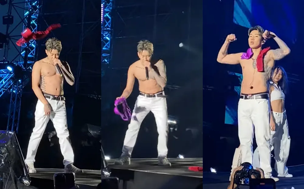 At one point in the song, Jay Park teasingly referred to his fans as “sexy girls” which is part of the song’s original lyrics. However, the scene excited some fans so much that they flung their bras on stage! Well, Jay Park wasn’t phased by it raining bras, in fact, he stopped to pick a few up and draped them over his shoulders. The singer then finished with the bras hanging off his shoulders, even taking care to pose with them.