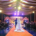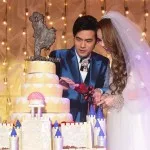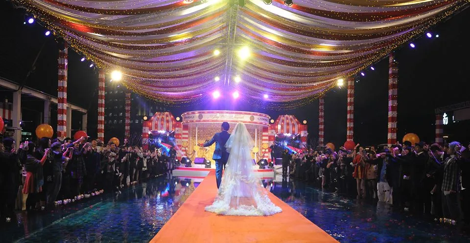 While carrying Hannah’s pet dog, Jay Chou walked down the red carpet aisle arm-in-arm with his wife on an elevated platform in the swimming pool to the main stage that was decorated like a carousel. “A Journey Diary about Love”, a wedding march composed by the singer in England, was played in the background by a percussion and a jazz band. Dinner tables were placed on the two long sides of the pool so that the guests can witness their ceremony too.