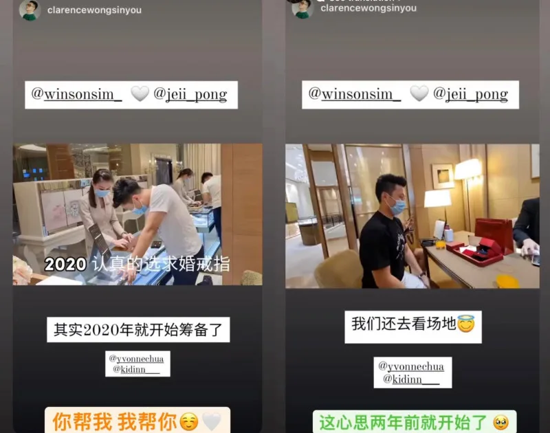 According to friend and fellow influencer Clarence Wong (黄晨祐), Winson had actually been thinking about proposing to Jeii since 2020. He shared a video of him carefully choosing a ring and added that they had actually visited the venue to vet it first. “This thought began two years ago,” he wrote.