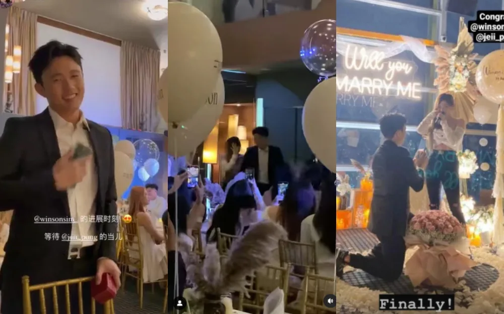 However, the proposal to his girlfriend of five years only took place on Saturday. The venue had been beautifully decorated with balloons, flowers and a big neon sign reading “Will you marry me?” on the stage. Winson had also taken pains to invite all their friends, including names like Lim Shangjin, Qiu Wen, Jestinna Kuan, Gladish, Haoren and of course, Jeii’s brother Gaston.