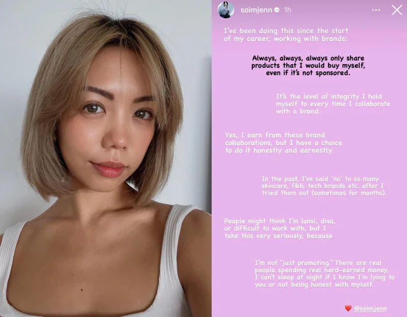 Jenn went on to explain that she always aims to earn from her brand collaborations as “honestly and earnestly” as possible. “In the past, I’ve said “no” to so many skincare, f&b, tech brands, etc., after I tried them out (sometimes for months),” she said.