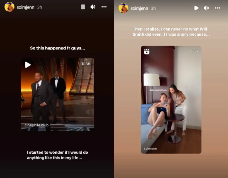 Jenn stated watching Will lose his temper had made her wonder if she would ever be able to do something similar. “Then I realised, I can never do what Will Smith did even if I was angry because…” she wrote and let her video do the speaking for her.