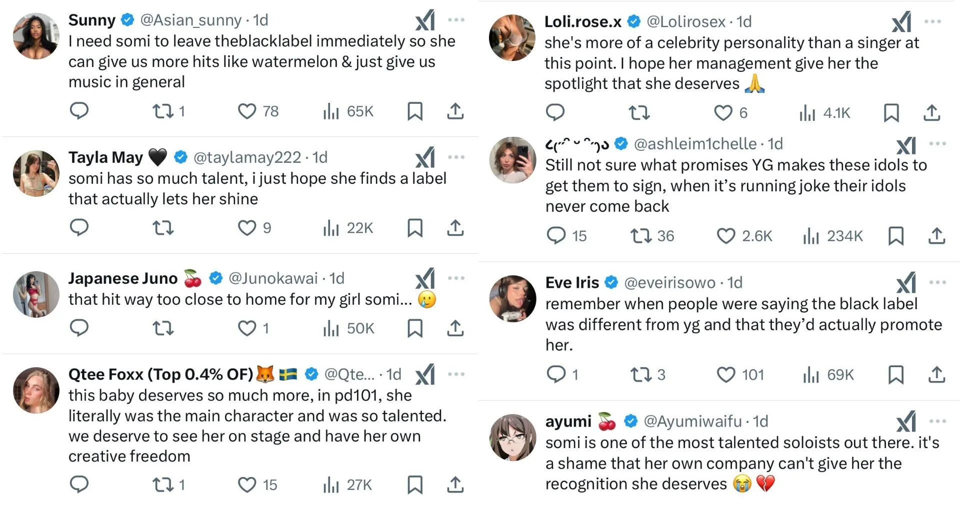 Fans had expected The Black Label to maximise her potential and maintain her public presence, yet her promotions remain limited. Many fans have voiced their frustration towards The Black Label, arguing that Somi deserves better and that the company is failing to support her properly. What do you think?