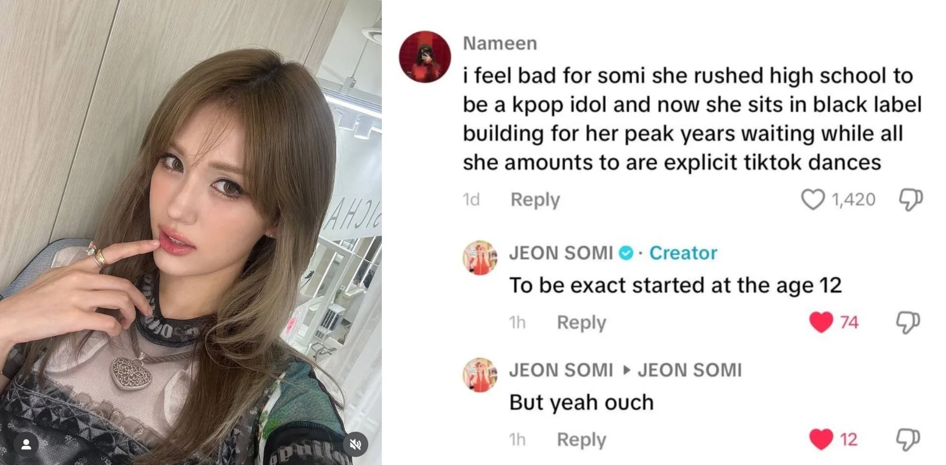 The singer, known for hits like “DUMB DUMB” and “Fast Forward”, recently responded to a critical comment about her career on TikTok. The now-deleted comment questioning her success and career trajectory, lamenting that all the Somi amounts to now is just dancing on TikTok. The comment appeared to feel sorry for her for not doing much as an idol – a point which Somi seemed to acknowledged.