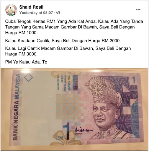 “Try and take a look at the RM1 notes that you have now. If you have one with the same signature, I’ll buy it from you for RM1,000. If it’s in a good condition, I’ll buy it for RM2,000. If the note is in perfect condition (as seen in the image), I’ll buy it for RM3,000,” he wrote on his Facebook.