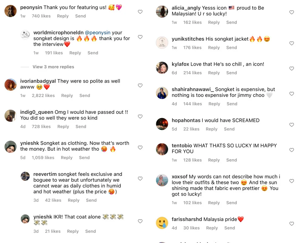 Scrolling through the comment section, netizens seemed very excited to see the shoemaker donning the beautiful jacket. Many comments are from Malaysians, saying they’re proud to see Malaysian designers showing off a national treasured fabric. Many also pointed out how humble they were, despite being world-famous celebrity designers!