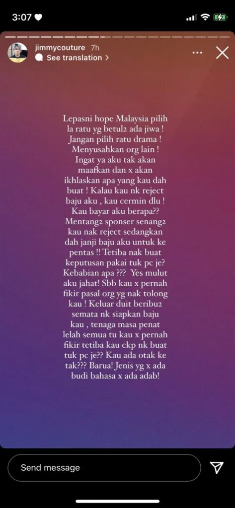 However, our Miss Grand this year, Lishalliny Kanaran, has apparently managed to cross the renowned designer by rejecting his evening gown (which was shortened to EG in the Instagram posts) design at the very last minute. What a waste of Jimmy’s time!
