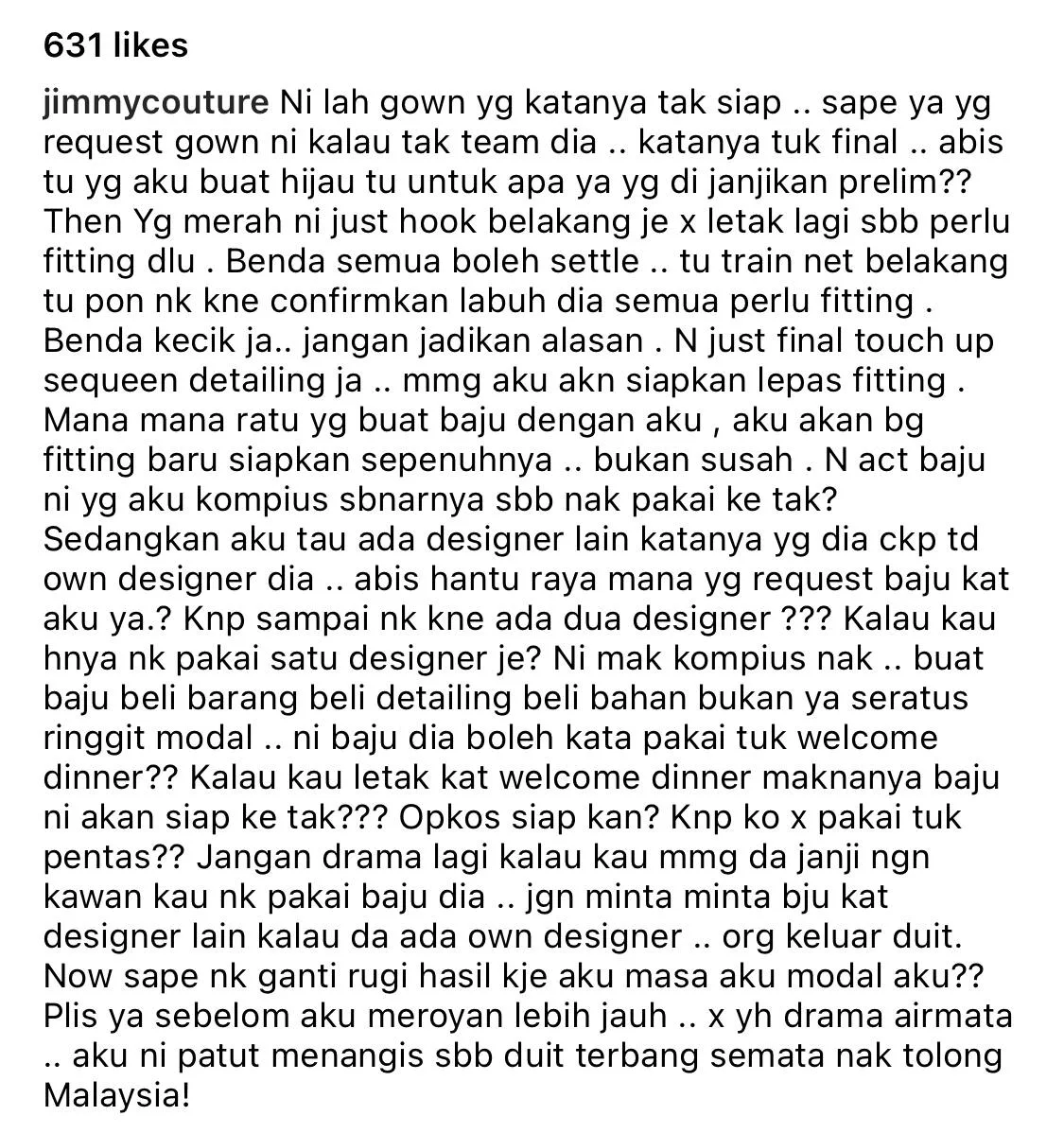 Disappointedly, he wrote, “not one ringgit, not a hundred ringgit, but THOUSANDS; I have spent thousands in completing this dress and yet you want to wear this just to the press conference? Ridiculous! I’m sleepless, I wasted money and energy, rejected customers’ orders, my hands are swollen, I postponed visiting my parents, just to get your evening gown done and you won’t even wear it? Where did you (leave) your brains somewhere?”