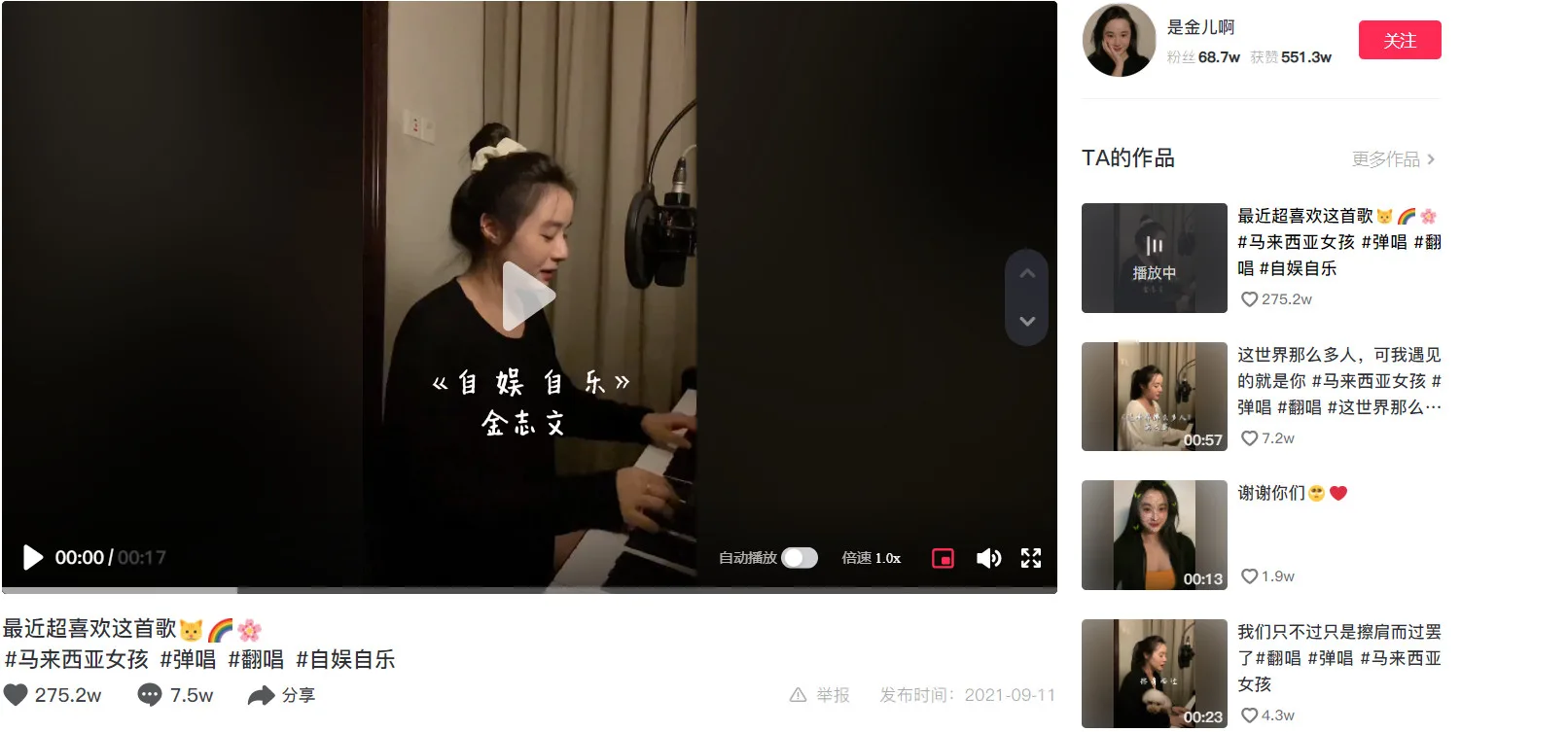 Among the many different types of videos, one popular genre is doing covers of songs. This was an area where Douyin user “It’s Jiner (是金儿啊)” stole the show. This Malaysian girl’s popularity shot up after her brief cover of “Self-Entertainment (自娱自乐)”.