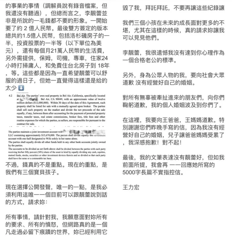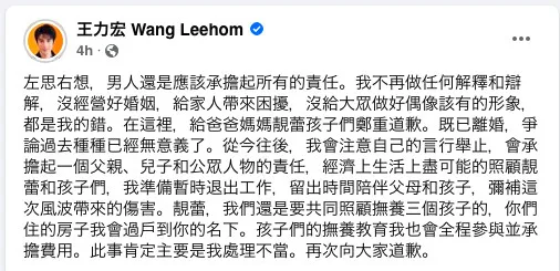 I’m prepared to take a break from work and spend more time with my parents and children to make up for the damage that has been caused. Jing Lei, we still have to look after and bring up our three kids together, [so I’ll] transfer the house that you’re living in to you. I will bear the cost of raising and educating the kids. This matter was definitely caused by me not handling it well. Once again, I apologise to everyone.”