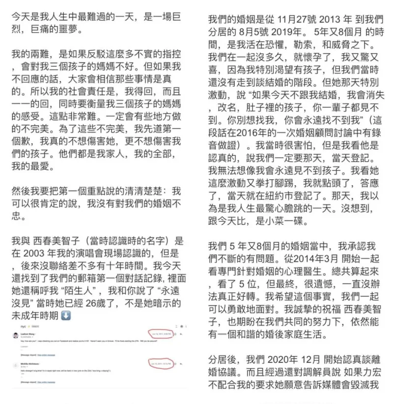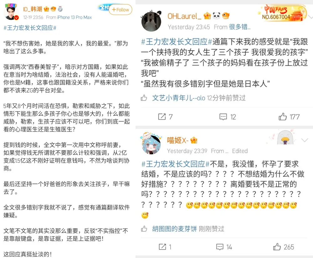 Others also pointed out that Jing Lei’s nationality did not matter so there was no need to emphasise it in his post. Furthermore, Weibo blogger Han Chao (韩潮) stated that his 5 years and 8 months of marriage supposedly spent in fear still produced several kids. “Refuting “false allegations” is not by typing on the keyboard,” he said sternly. “It relies on evidence, show some evidence!”