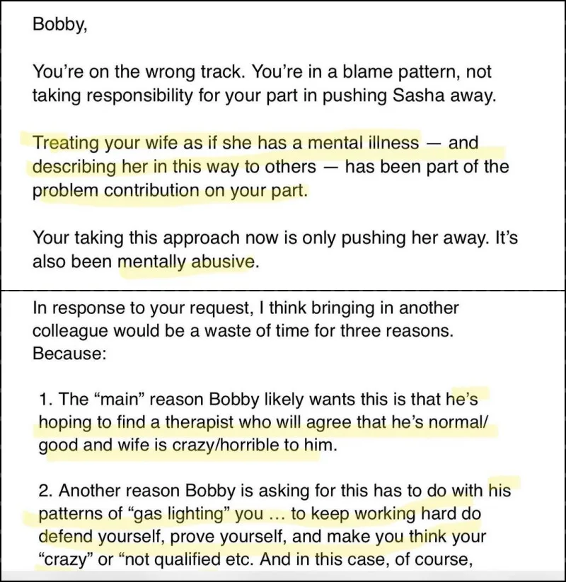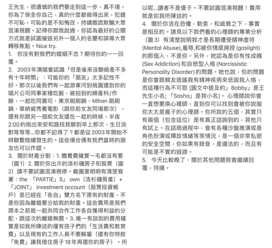The psychologist also supposedly claimed Leehom would go through many professionals until he found one that agreed with his narrative; that his wife is a lunatic. Jing Lei included photos of the psychologist’s notes to her. She stated that “Bobby” and “Sasha” were Leehom and Jing Lei’s nicknames respectively. “Of the five you mentioned,” Jing Lei wrote. “Only two (including this one) were actually consulted. The others were only tried.”