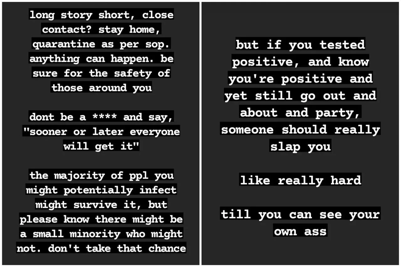He reminded everyone to not take the chance of infecting people with the virus because not everyone will survive it. He also grabbed the opportunity to reprimand those who are selfish during this pandemic, “If you tested positive, and know (it) and yet still go out and about and party, someone should really slap you till you can see your own ass.”