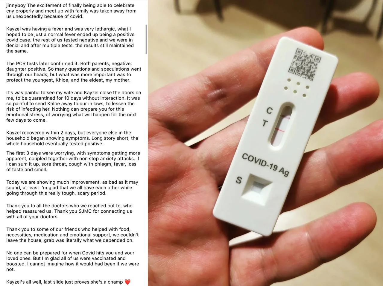 JinnyBoy not only took the time to update his followers on his household’s situation, but he also took the chance to spread public awareness about the virus (in case there are still people who lack awareness despite the fact that we’ve been in the pandemic for a whole 2 years now). He told the public to always be careful because, “When you’re a close contact, and you do a PCR and results (come out) negative, you’re not really out of the woods completely.”