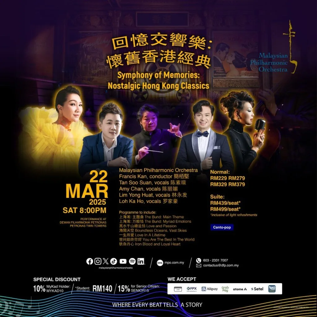 Journey through Hong Kong’s timeless classics with the Malaysian Philharmonic Orchestra! Revel in a night of nostalgia with masterpieces from the silver screen, popular songs from legendary Hong Kong stars, and more! Click here to get your tickets!