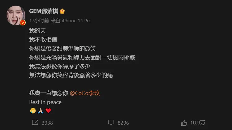 Just like how many others were shocked and could not believe the news of Coco’s passing, Taiwanese singer G.E.M., is still in shock. She wrote in a post on Weibo, “You’ve always wore a sweet and warm smile. You’ve always faced all your trials and hardships with so much courage and resolution. I can’t imagine how much you’ve been through and how much pain is hidden behind that smile of yours. I will forever miss you @Coco. Rest in peace.”