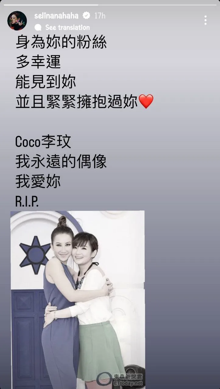 On her Instagram story, Taiwanese artist Selina Jen posted a photo of her and Coco embracing each other with the caption, “As your fan, I was extremely lucky to have met you and given you a tight hug. Coco, you are my idol forever. I love you. R.I.P.”