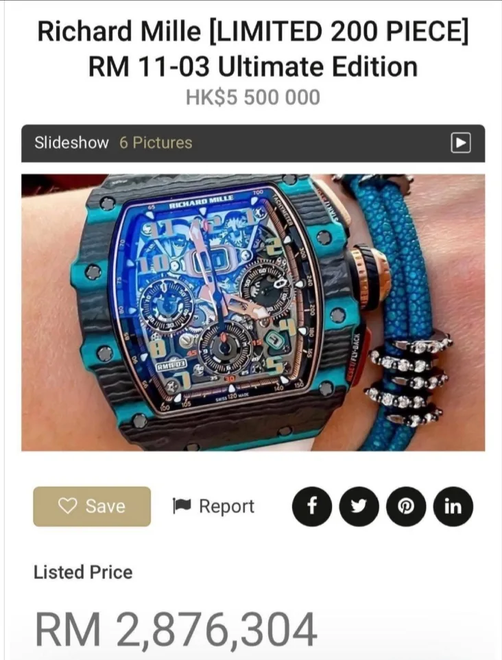 Lin was wearing bicycle gear, which includes a colourful orangey and red cycling shirt, a helmet, and protective glasses. But what grabbed the attention of netizens is the fancy-looking watch that’s probably worth more than a typical-looking house. The watch is an RM 11-03 Ultimate Edition created by Franco-Swiss luxury watchmaker Richard Mille and is worth RM2.8 million.