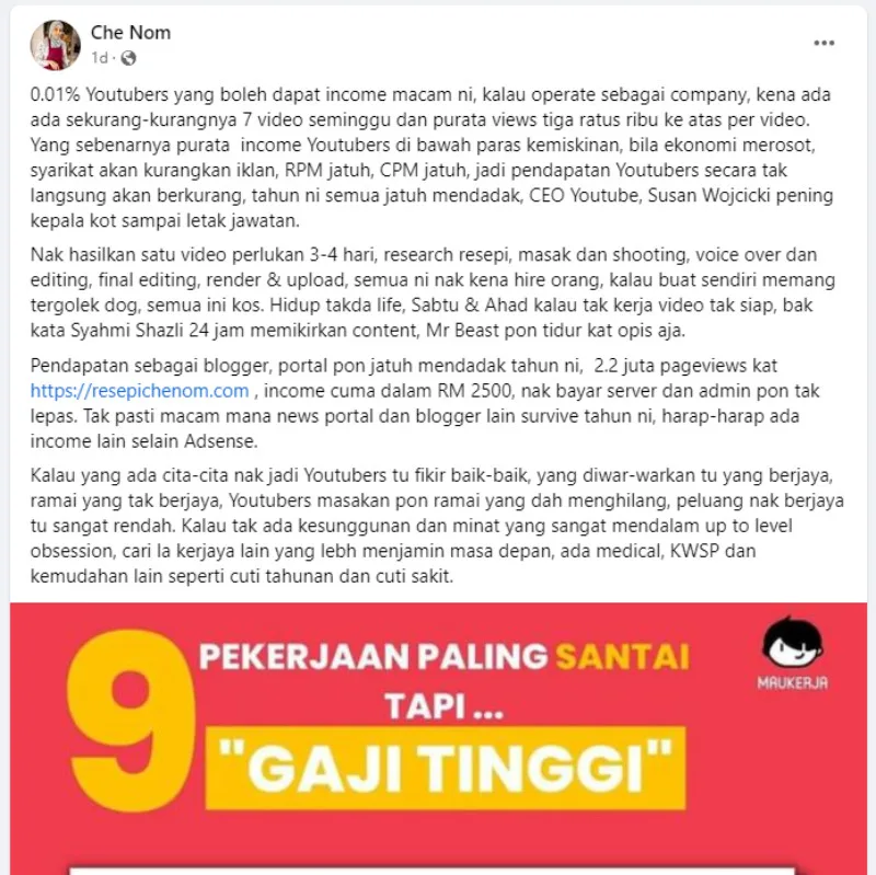 The celebrity chef shared her thoughts on the infographic and how exactly accurate it is. Taking to her Facebook, the content creator revealed that the high RM360K income is only possible if the YouTube channel is being managed by a company and even then only 0.01% of YouTubers or channels will make that much money. Che Nom added that the channel must post as frequently as possible in order to attract consistent views.