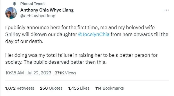 Uploaded on 22nd July by an Anthony Chia Whye Liang, the Twitter post reads verbatim as such: “I publicly announce here for the first time, me and my beloved wife Shirley will disown our daughter @JocelynChia from here onwards till the day of our death. Her doing was my total failure in raising her to be a better person for society. The public deserved better then this.”
