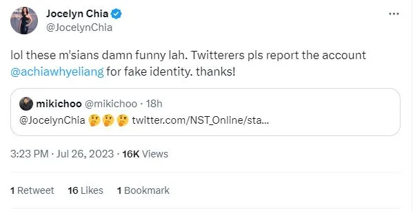 After it was brought to her attention, Jocelyn Chia has since confirmed that the Twitter account @achiawhyeliang does not belong to her dad, adding that she believes it might be a Malaysian responsible for the account. She has also encouraged others to report the account. Here’s her full comment: