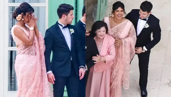 According to People, the pastel pink saree worn by Priyanka Chopra, is a traditional Indian gown designed by Sabyasachi. It featured a drape embroidered with floral designs. The “Quantico” actress pulled her into a casual updo and accessorised it with a blush-coloured rose just below her right ear.