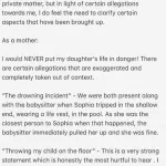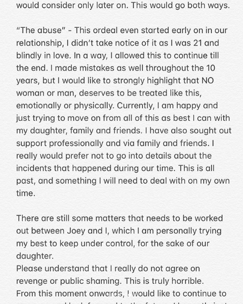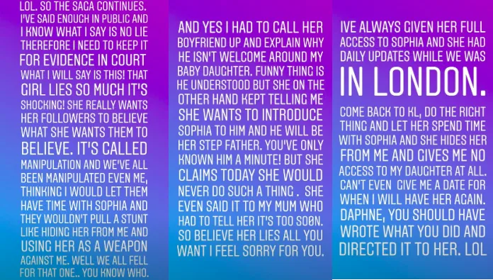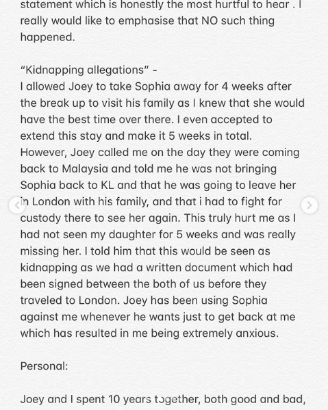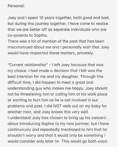 In her statement, the television personality defended herself against “the drowning incident” in Bali, denied “throwing my child on the floor”, and also addressed the “kidnapping allegations”, as well as Joey’s abusive behaviour. She also clarified that she “did nOT walk out” on Sophia for her current beau, Matthieu Gsphe.