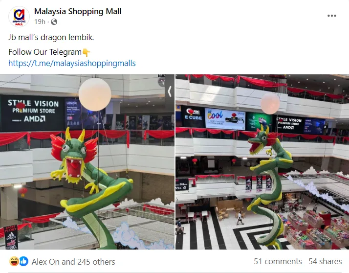 But, as it turns out Plaza Pelangi in Johor Bahru was recently revealed to have lackluster decorations, and it mainly had to do with their awkward, wacky-looking dragon. Needless to say, netizens were quick to flock to the Facebook post to deliver their own witty commentary on it.