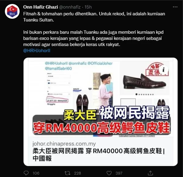 On 11th July, Johor Menteri Besar Datuk Onn Hafiz Ghazi had posted a tweet regarding his ‘expensive shoes’ in which Chinese-language newspapers had reported he had bought them at a cost of almost RM 40k. The Johor MB denied such allegations and accused the newspapers for slander.