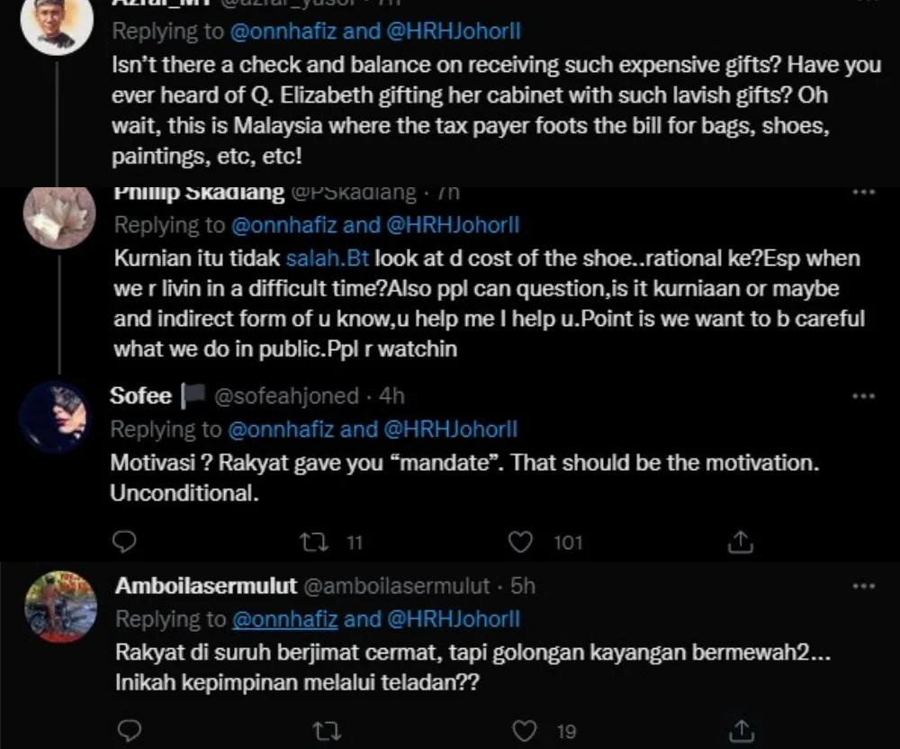 Some users had responded in praises towards Datuk Onn and the Sultan for their hard work and charitable attitude. However, other users were focused on the price of the shoe, regardless of whether it was a gift or not. “Motivation? The people gave you “mandate”. That should be the motivation. Unconditional,” wrote a user. Another wrote “The people have been told to be thrifty but the wealthy live luxuriously… Is this leadership by example?”