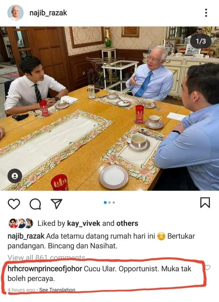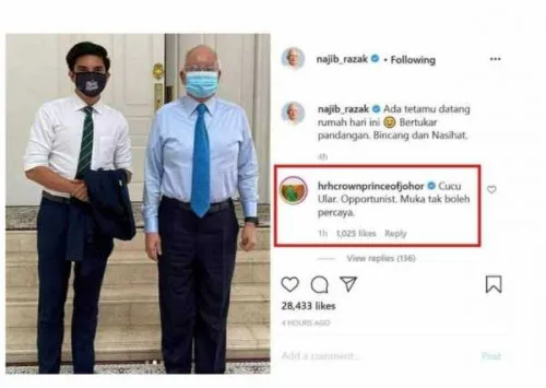 His action has in turn raised several speculations among netizens. In case you’re wondering why, the Malaysian United Democratic Alliance (MUDA) founder was among those who had publicly criticised the Pekan MP in the past. Apparently, Najib’s post also managed to catch Tunku Mahkota Johor (TMJ) Tunku Ismail Idris’ attention.