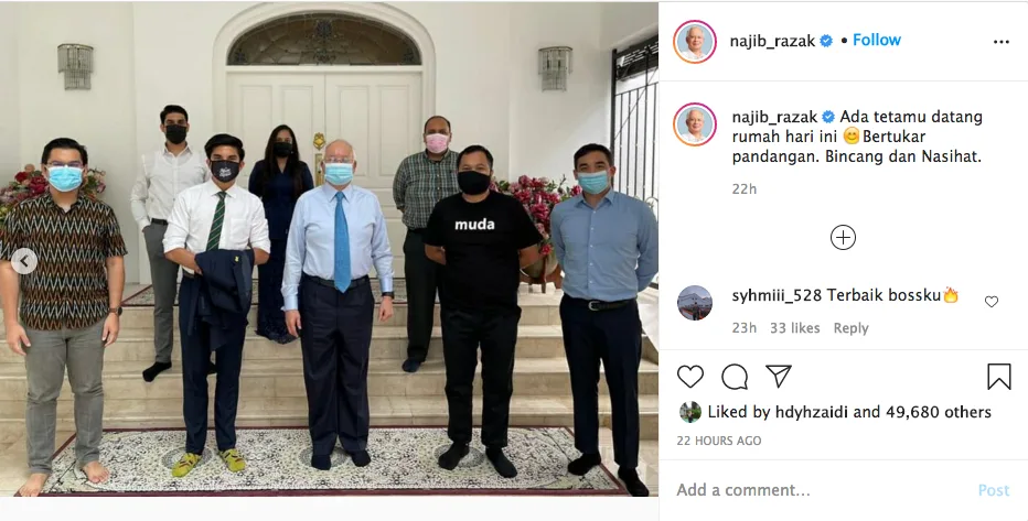 Datuk Seri Najib Razak shared a few photos of Syed Saddiq’s visit to his residence on his Instagram yesterday evening.