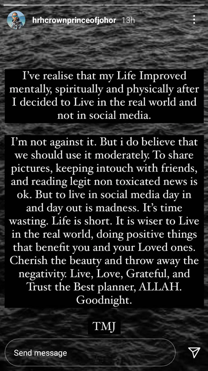In his most recent updates online, the Johor Prince revealed to his followers that his life has improved mentally, spiritually, and physically after he decided to live in the “real world” as opposed to spending time on social media.