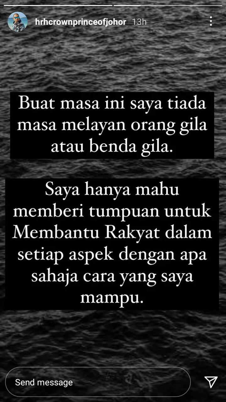 In another IG Story post, the former Football Association Malaysia (FAM) president wrote, “For now, I don’t have time to entertain crazy people or crazy things. I just want to focus on helping the people in every aspect in whatever way I can.”