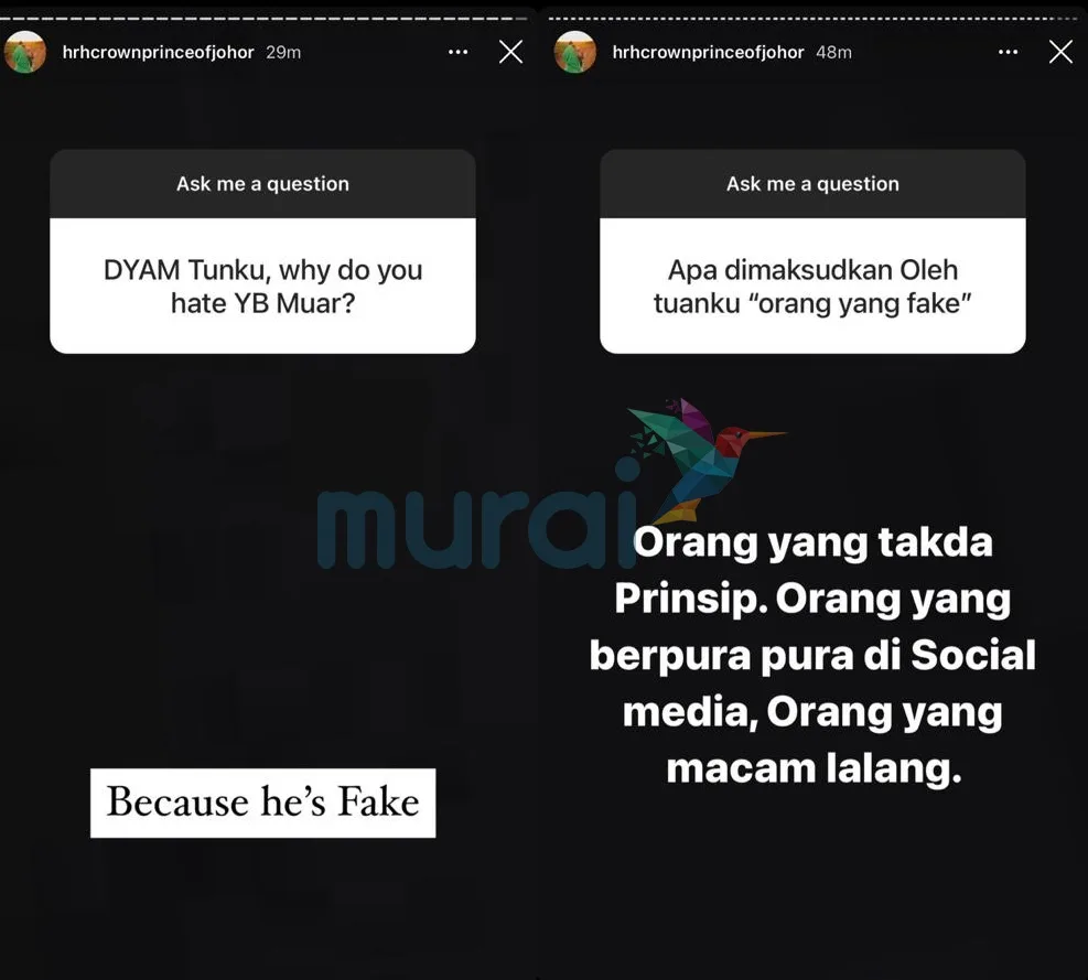 One of his followers on IG prompted, “Your Majesty, why do you hate YB Muar?” As pointed out by TMJ, he is not keen with the YB in question because of his “fake” attitude. Additionally, another user asked. “What do you mean by fake people?” to which he responded, “An individual who has no principles and only likes to pretend on social media.”